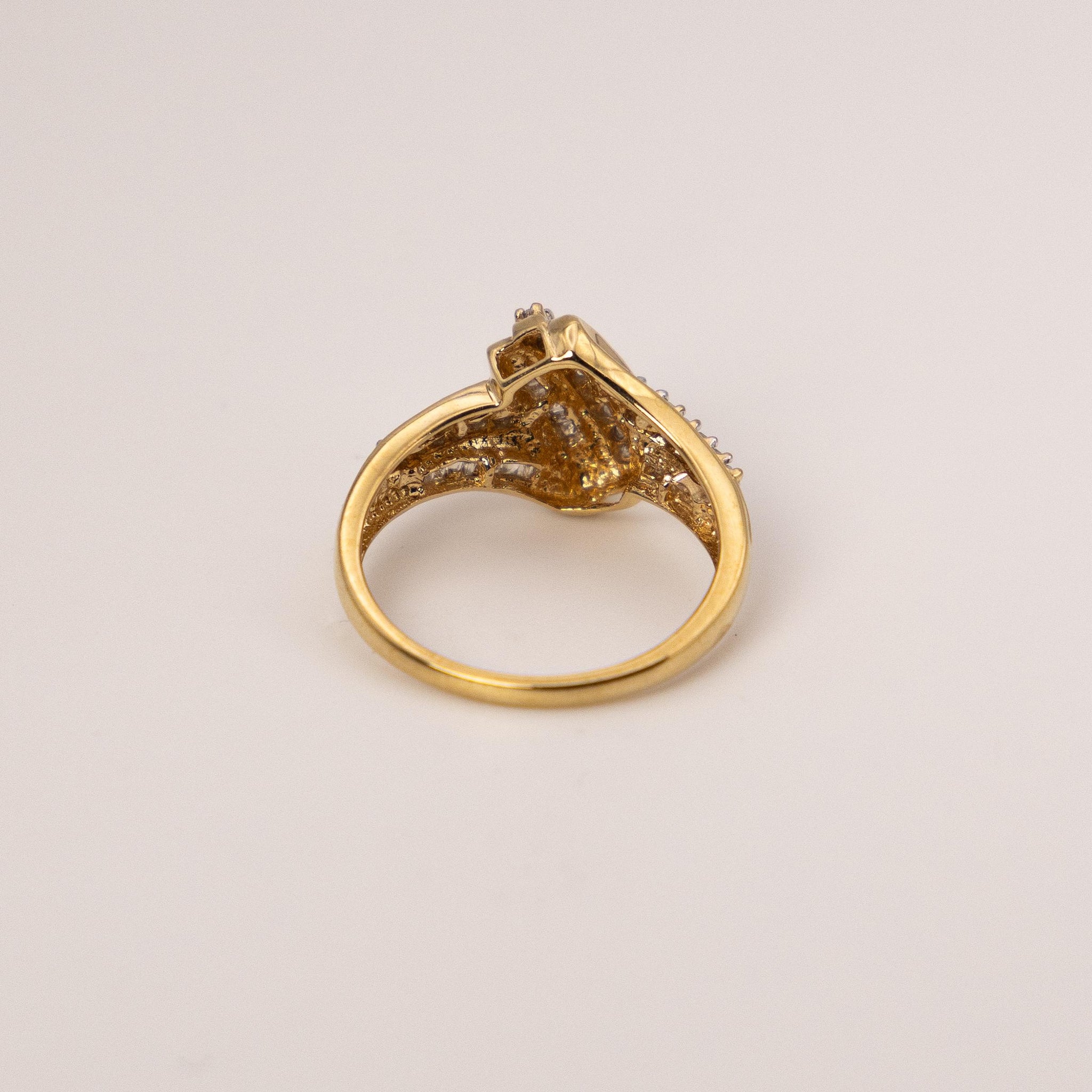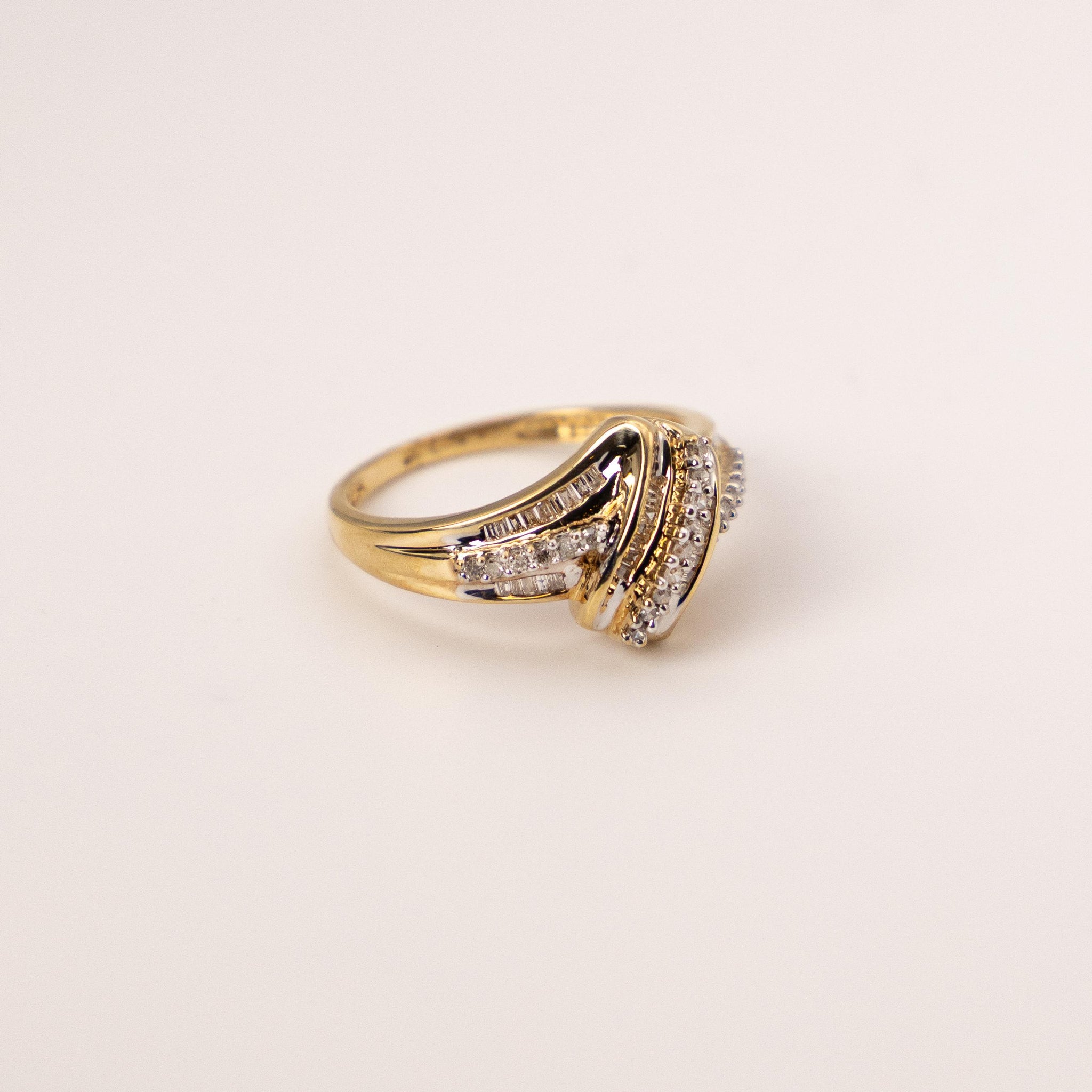 A striking vintage statement ring in lustrous 14-karat yellow gold, exquisitely featuring an intertwined, multi-row crossover design encrusted with both baguette and round-cut diamonds. This captivating piece blends classic glamour with bold architectural elegance.