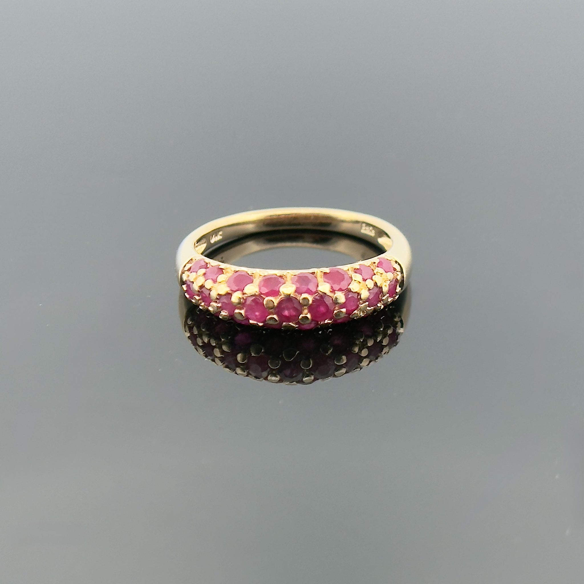 Crafted in 14‑karat yellow gold, this pavé‑set ruby gemstone band is a sublime expression of elegance. The rubies, meticulously selected for their rich, saturated red hue, are set in a pavé style—tiny stones placed closely together with small beads or prongs securing them, giving the band a continuous shimmer of color.