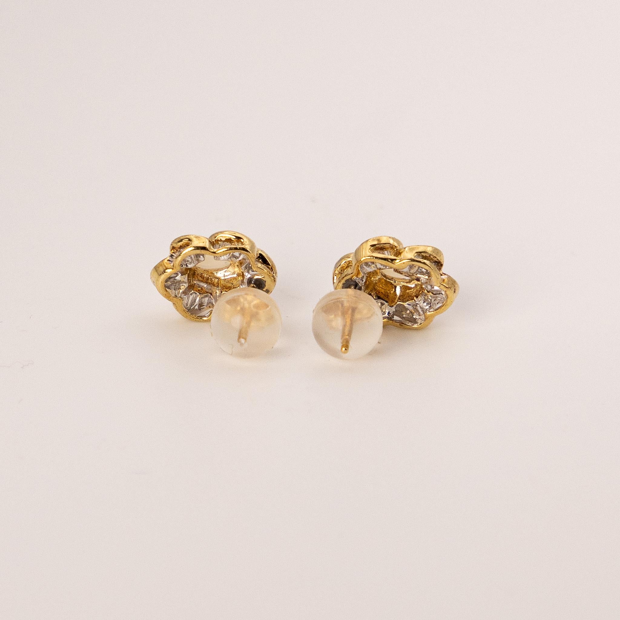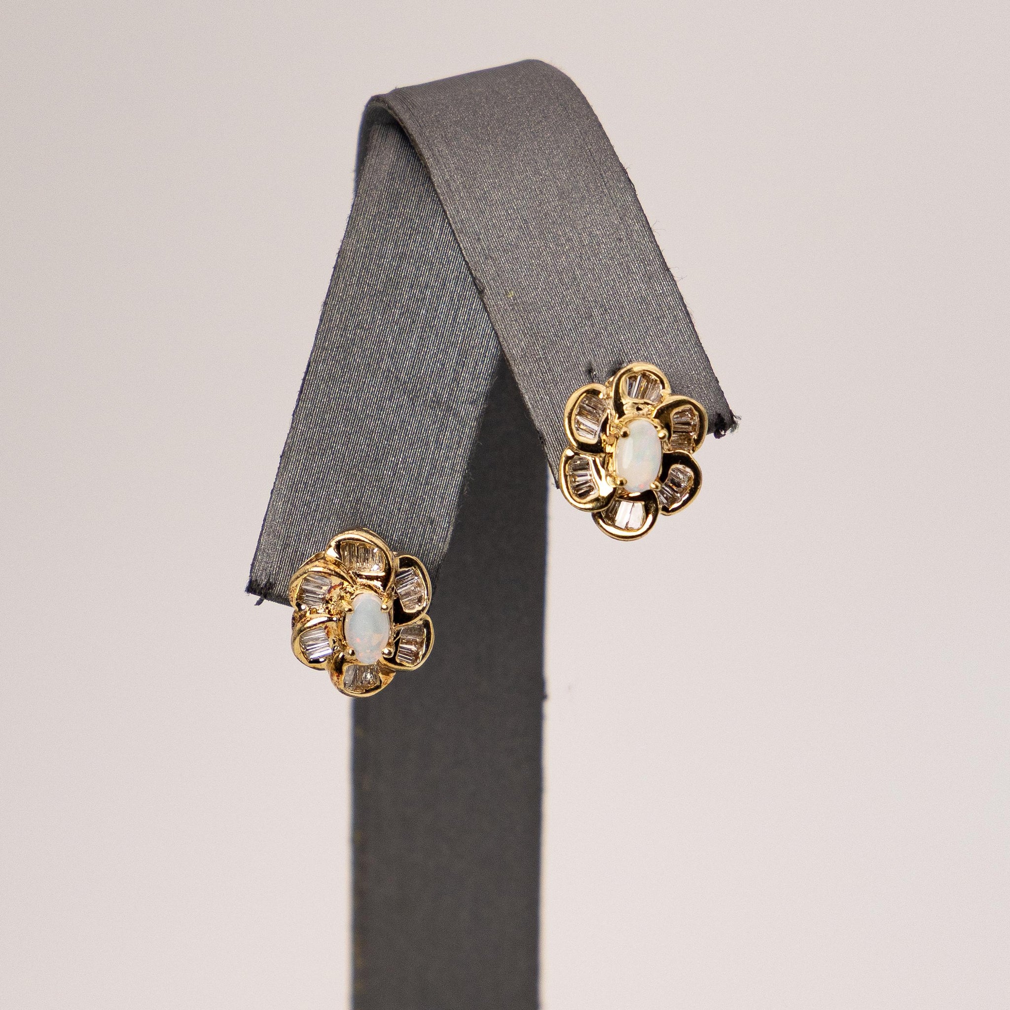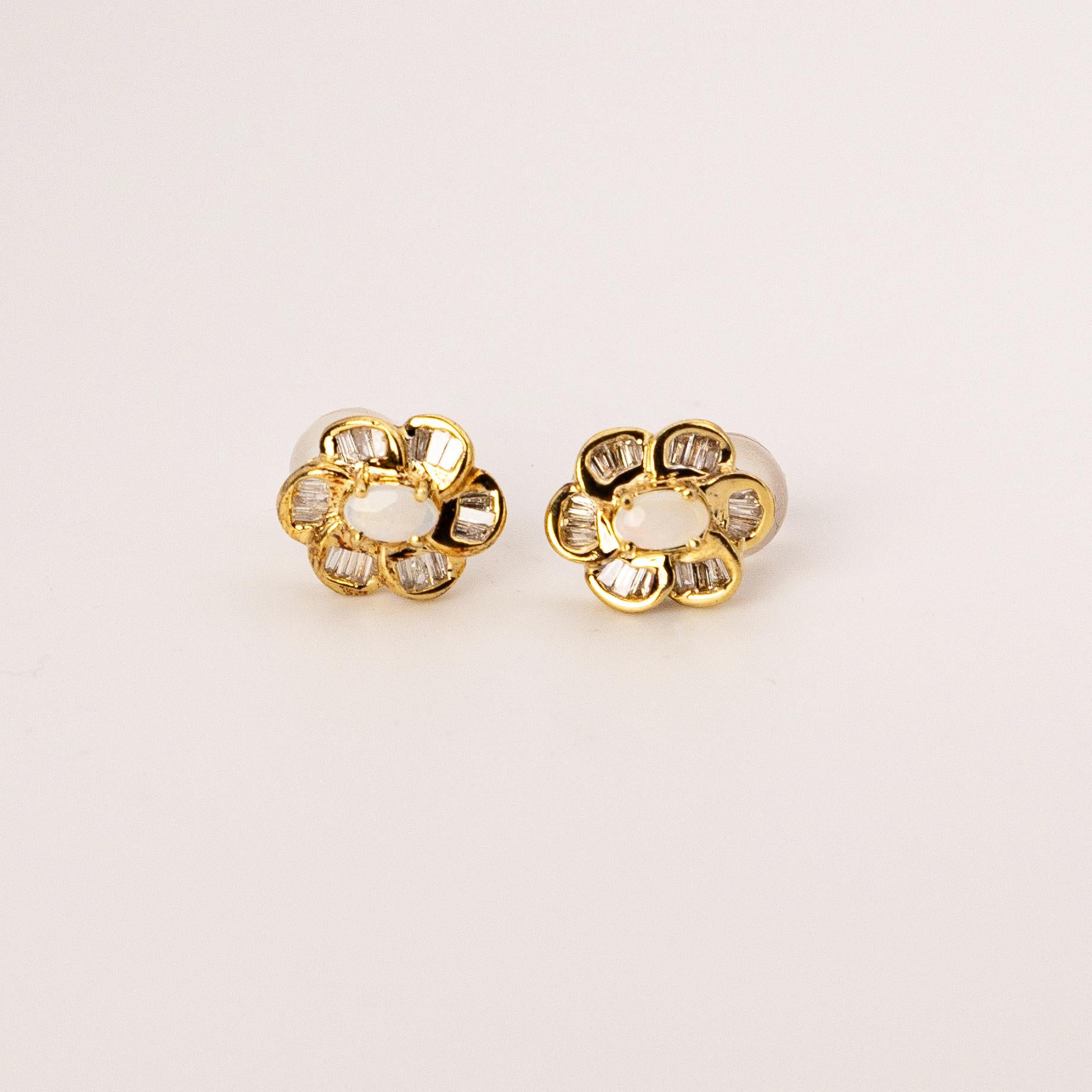 14K Yellow Gold Opal Flower Earrings – White Baguette Diamond Halo
